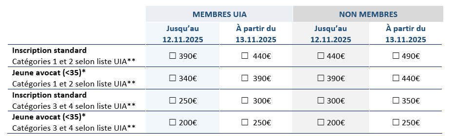 Toute inscription reçue par l’Union Internationale des Avocats (UIA) et accompagnée du règlement intégral des frais correspondant aux manifestations choisies sera confirmée par écrit.